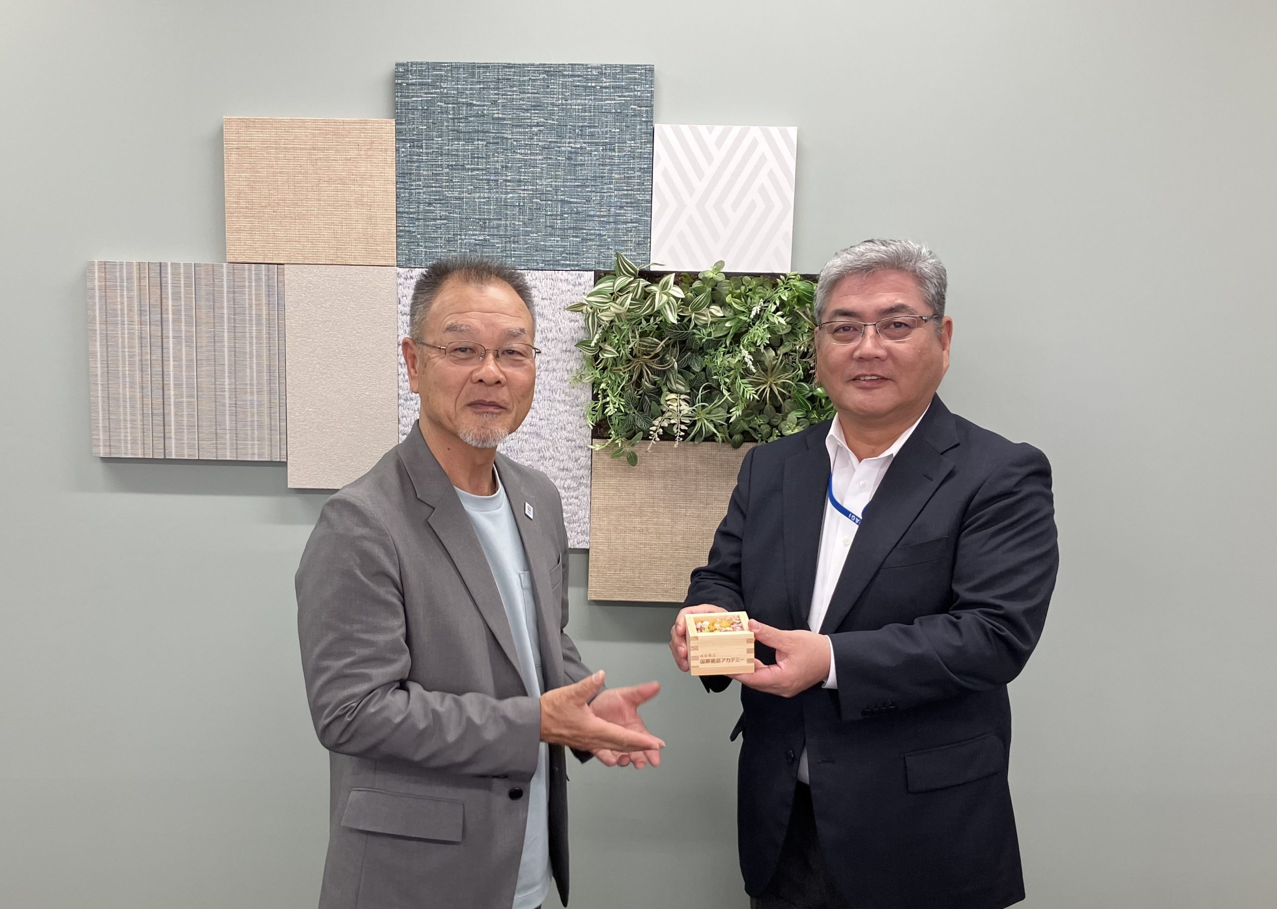 昨年に引き続き「ぎふワールド・ローズガーデン」の作庭に使われる予定です。今西学長が来社され、生徒さんが作られた枡アレンジメントと感謝状を頂戴しました。
