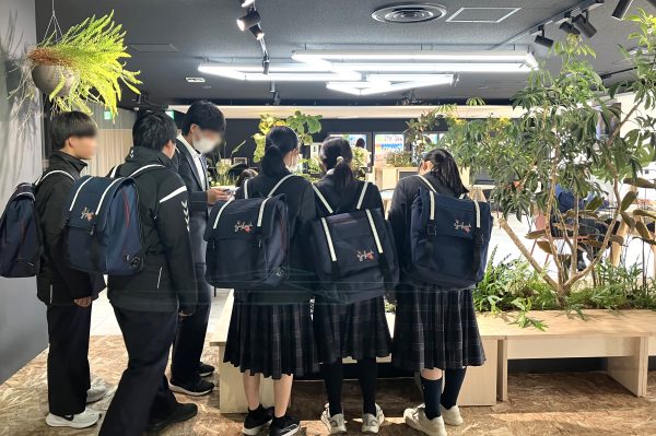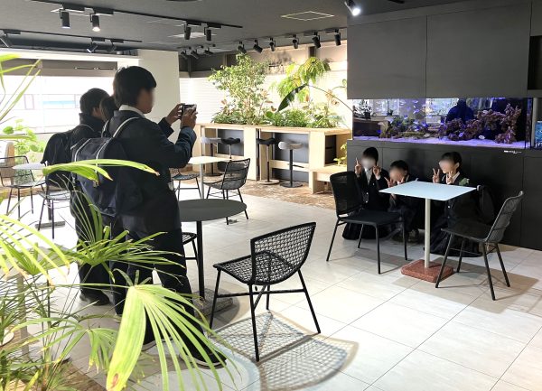 説明のあと、実際に緑化されたオフィス空間へご案内した際には、植物や水槽の魚に興味を持ってくださり、男子・女子チームがお互いに記念撮影を楽しむ姿が印象的でした。